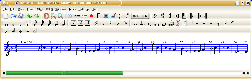 The first thing I noticed was it is very quiet by default. This led on a quest which turned up such gems as the sfxload command, the fact NoteEdit forgets its settings, and by default it goes to MIDI out, not the sequencer. This is on my Audigy, YMMV. Happily, later versions seem to not have the same bugs: my settings are remembered now. I still have to sfxload on reboot, though (which isn't NoteEdit's fault at all).