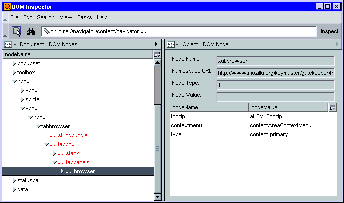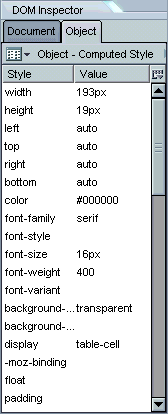 Ever wondered what's really going on in a page? The DOM inspector opens everything up. You can examine all nodes - elements and #text. You can see the currently applied attributes, the computed style, the currently applied style rules and more. This works as a separate window or as a sidebar. This is a really useful debugging tool - you can find out exactly what your scripts have generated, without writing large amounts of debug queries.