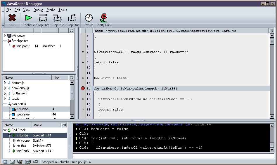 Taking the console further, the script debugger lets you examine all the functions in currently loaded scripts. Simply load the debugger before the page you want to debug (or refresh if it's already there). You should see a list appear in the debugger of all the files containing scripts, which can be expanded to reveal a list of functions. Selecting one of these functions will show its code. Next to each line of code is a mark - clicking this will set a breakpoint. If this line of code is reached, then the script will stop running, and you can examine a list of variables to see their current values. You can then stop or continue the script. Errors sent to the JavaScript console can be optionally mirrored in the debugger. You can also have your scripts profiled - showing which functions are taking up the time. The debugger has a project and a development webpage.